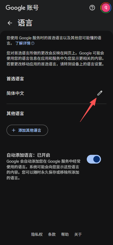 向下滚动到 “语言” (Language) 部分,点击旁边的铅笔图标(✎)进行编辑 。
